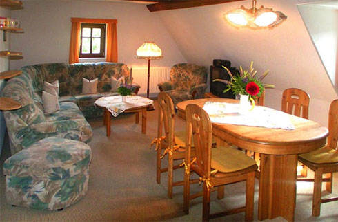 Das Ferienhaus Landhaus Sorgenfrei liegt ruhig und zentral in Ehrenberg. Das liebevoll restaurierte Denkmalhaus bietet Ihnen komfortable Ferienwohnungen mit Wohnzimmer, Küchenzeile, zwei Schlafzimmern sowie DU/WC. Besonders originell gestaltet sind unsere Betten - wir haben u.a. Trabant-Betten und Erntewagen (siehe Foto). Möglichkeiten zur Entspannung finden Sie im Garten mit Wiese. Hier befindet sich auch ein Kinderspielplatz. Für Radtouren können Sie direkt bei uns Fahrräder ausleihen. Durch die Lage am Rande des Nationalparks Sächsische Schweiz erreichen Sie in kürzester Zeit alle Ausflugsziele des Elbsandsteingebirges. Natürlich können Sie auch Ausflüge nach Dresden, Bad Schandau, Königstein, Pirna und in unser Nachbarland Tschechien unternehmen.