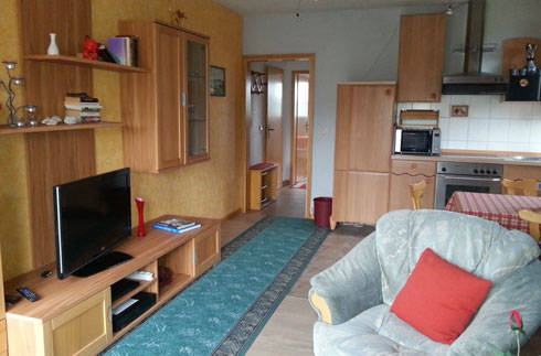 Wohnen: Sitzgarnitur - gemütliche Schlaf-Eck-Couch (2 Personen), Flachbild-TV, Radio, Esstisch mit 4 Stühlen