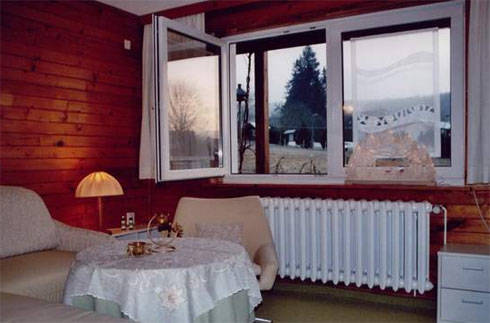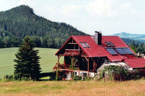 Unsere gemütliche und komfortable Nichtraucher-Ferienwohnung für 2 - 4 Personen liegt ruhig am Kleinen Zschirnstein und ist sehr familien- und seniorenfreundlich. Die Wohnung hat einen separaten Eingang und besteht aus einem Wohn-Schlafraum, einer modernen und komplett ausgestatteten Küche mit Spülmaschine, zwei Duschen, zwei WC´s, Zentralheizung und einem Kaminzimmer, welches sich gut als Frühstücksraum eignet. Von der überdachten Terrasse aus haben Sie einen schönen Ausblick über Wiesen und zu Bergen der Sächsischen Schweiz. Auch den Garten mit Grill können Sie nutzen. Die wiesen- und waldreiche Gegend eignet sich hervorragend für Wanderungen und Radtouren. Bis nach Bad Schandau an der Elbe sind es nur ca. 10 Autominuten und Ausflugsziele in Tschechien sind ebenfalls nicht weit entfernt.